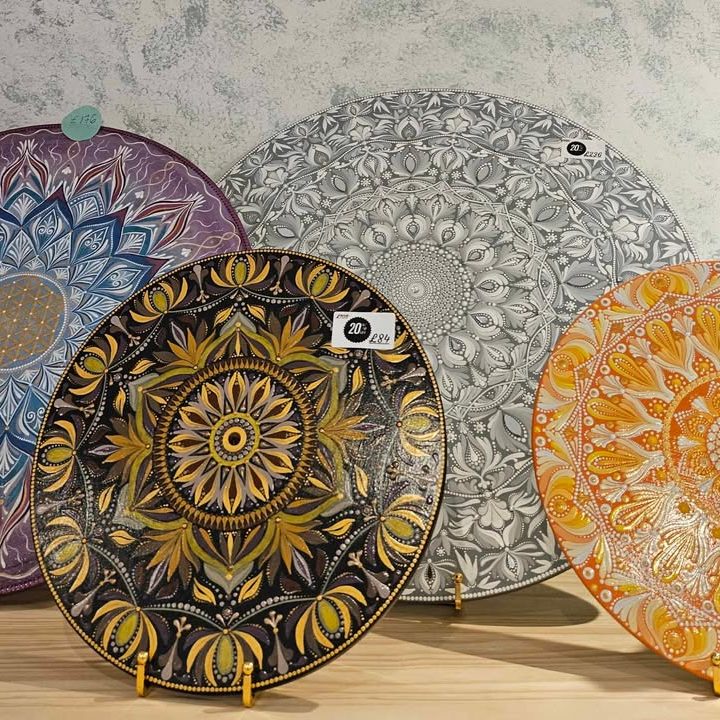 Hand painted mandals murials, wall hangings, trinket dishes and more.