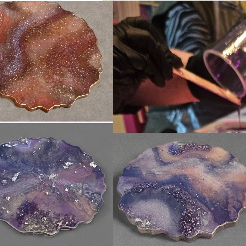 Artist guided workshop, where you Learn how to mix, colour and pour resin to create 4 of your very own coasters approx 12cm wide. There will be a variety of colourants and additions available (crushed glass, coloured foil, stones, mica powder, chameleon powder, alcohol inks etc)