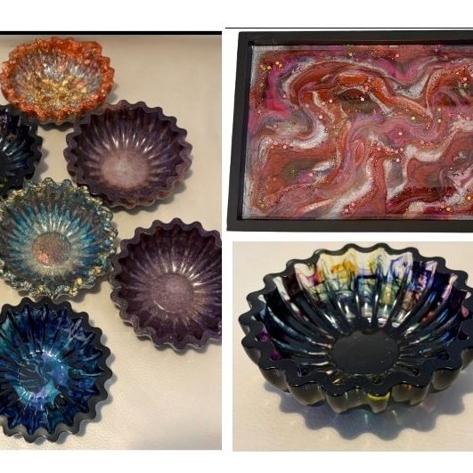 Artist guided workshop, where you Learn how to mix, colour and pour resin to create a small rectangular tray using a “marble” pour and one scalloped bowl where you can choose a variety of pour techniques. Choose from a variety of colours, mica powders and glitters to create something truly special.