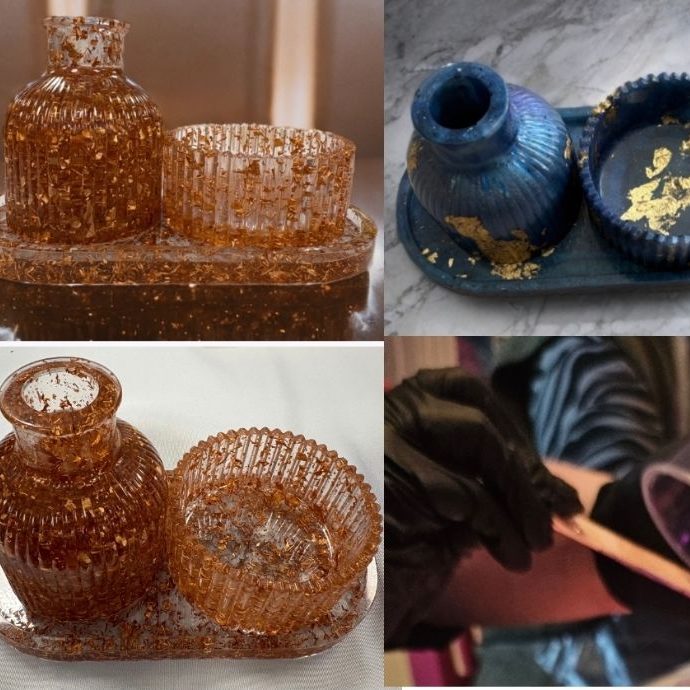 Artist guided workshop, where you Learn how to mix, colour and pour resin to create a 3 piece bathroom set. There will be a variety of colourants and additions available (crushed glass, coloured foil, stones, mica powder, chameleon powder, alcohol inks etc)