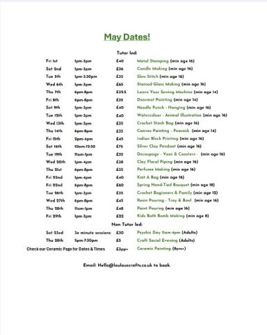 Attended a fabulous workshop. Not only was the workshop held in a bright, spacious room but the shop was a joy in itself - full of a wonderful selection of hand crafted items with something for everyone. Lots of workshops are on offer run by local teachers & companies all reasonably priced. Well worth a visit.